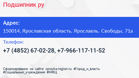 Подшипник.ру по адресу 150014, Ярославская область, Ярославль, Свободы, 71а в дальнейшем Организация, размещена в следующих категориях: