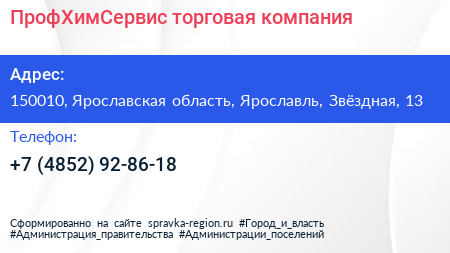 ПрофХимСервис, торговая компания по адресу 150010, Ярославская область, Ярославль, Звёздная, 13 в дальнейшем Организация, размещена в следующих категориях: