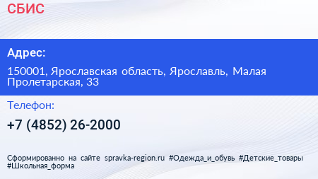 СБИС по адресу 150001, Ярославская область, Ярославль, Малая Пролетарская, 33 в дальнейшем Организация, размещена в следующих категориях: