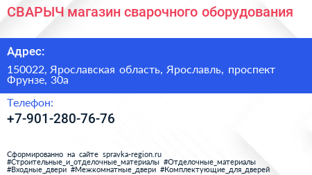 СВАРЫЧ, магазин сварочного оборудования по адресу 150022, Ярославская область, Ярославль, проспект Фрунзе, 30а в дальнейшем Организация, размещена в следующих категориях: