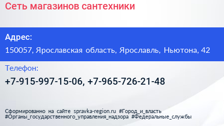 Сеть магазинов сантехники по адресу 150057, Ярославская область, Ярославль, Ньютона, 42 в дальнейшем Организация, размещена в следующих категориях: