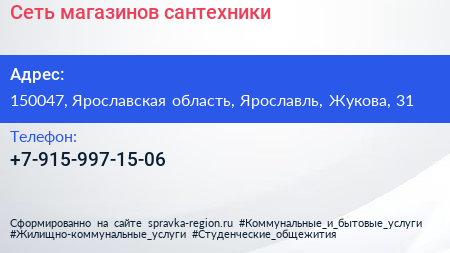 Сеть магазинов сантехники по адресу 150047, Ярославская область, Ярославль, Жукова, 31 в дальнейшем Организация, размещена в следующих категориях: