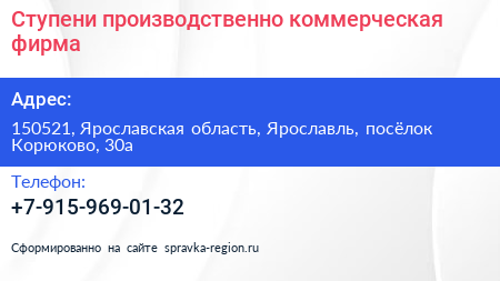 Ступени, производственно-коммерческая фирма по адресу 150521, Ярославская область, Ярославль, посёлок Корюково, 30а в дальнейшем Организация, размещена в следующих категориях: