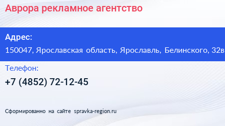 Аврора, рекламное агентство по адресу 150047, Ярославская область, Ярославль, Белинского, 32в в дальнейшем Организация, размещена в следующих категориях: