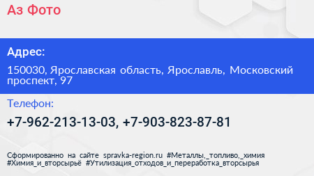 Аз-Фото по адресу 150030, Ярославская область, Ярославль, Московский проспект, 97 в дальнейшем Организация, размещена в следующих категориях: