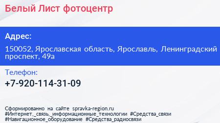 Белый Лист, фотоцентр по адресу 150052, Ярославская область, Ярославль, Ленинградский проспект, 49а в дальнейшем Организация, размещена в следующих категориях: