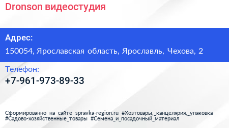 Dronson, видеостудия по адресу 150054, Ярославская область, Ярославль, Чехова, 2 в дальнейшем Организация, размещена в следующих категориях: