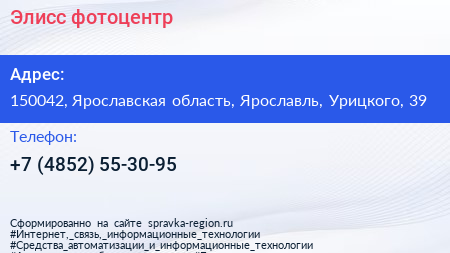 Элисс, фотоцентр по адресу 150042, Ярославская область, Ярославль, Урицкого, 39 в дальнейшем Организация, размещена в следующих категориях: