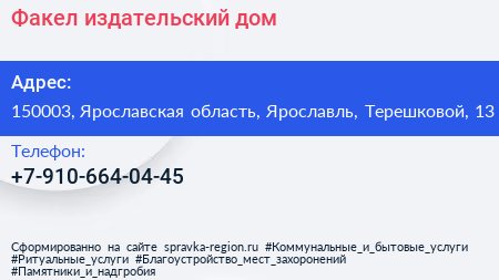 Факел, издательский дом по адресу 150003, Ярославская область, Ярославль, Терешковой, 13 в дальнейшем Организация, размещена в следующих категориях: