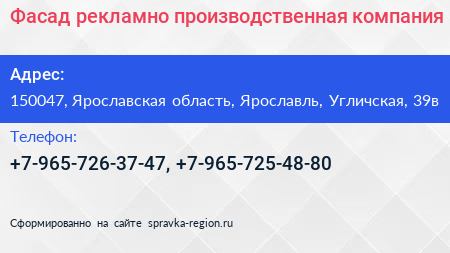 Фасад, рекламно-производственная компания по адресу 150047, Ярославская область, Ярославль, Угличская, 39в в дальнейшем Организация, размещена в следующих категориях: