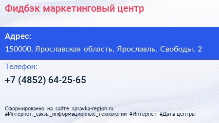 Фидбэк, маркетинговый центр по адресу 150000, Ярославская область, Ярославль, Свободы, 2 в дальнейшем Организация, размещена в следующих категориях: