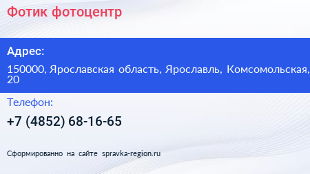Фотик, фотоцентр по адресу 150000, Ярославская область, Ярославль, Комсомольская, 20 в дальнейшем Организация, размещена в следующих категориях: