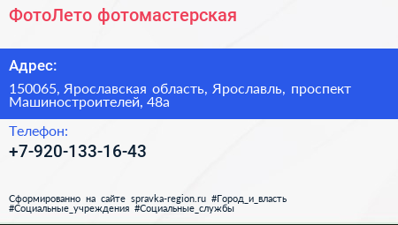 ФотоЛето, фотомастерская по адресу 150065, Ярославская область, Ярославль, проспект Машиностроителей, 48а в дальнейшем Организация, размещена в следующих категориях: