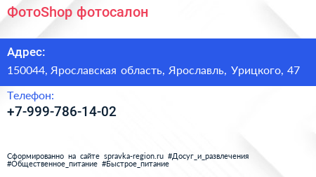 ФотоShop, фотосалон по адресу 150044, Ярославская область, Ярославль, Урицкого, 47 в дальнейшем Организация, размещена в следующих категориях: