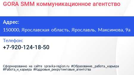 GORA SMM, коммуникационное агентство по адресу 150000, Ярославская область, Ярославль, Максимова, 9а в дальнейшем Организация, размещена в следующих категориях: