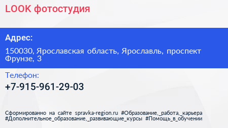 LOOK, фотостудия по адресу 150030, Ярославская область, Ярославль, проспект Фрунзе, 3 в дальнейшем Организация, размещена в следующих категориях:
