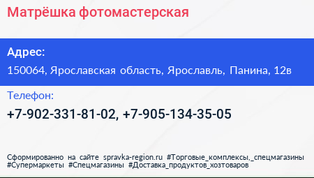 Матрёшка, фотомастерская по адресу 150064, Ярославская область, Ярославль, Панина, 12в в дальнейшем Организация, размещена в следующих категориях: