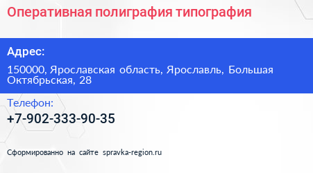Оперативная полиграфия, типография по адресу 150000, Ярославская область, Ярославль, Большая Октябрьская, 28 в дальнейшем Организация, размещена в следующих категориях: