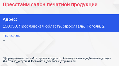 Пресстайм, салон печатной продукции по адресу 150030, Ярославская область, Ярославль, Гоголя, 2 в дальнейшем Организация, размещена в следующих категориях: