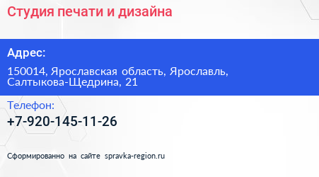 Студия печати и дизайна по адресу 150014, Ярославская область, Ярославль, Салтыкова-Щедрина, 21 в дальнейшем Организация, размещена в следующих категориях: