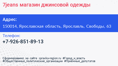 7jeans, магазин джинсовой одежды по адресу 150014, Ярославская область, Ярославль, Свободы, 63 в дальнейшем Организация, размещена в следующих категориях: