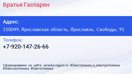 Братья Гаспарян по адресу 150049, Ярославская область, Ярославль, Свободы, 91 в дальнейшем Организация, размещена в следующих категориях: