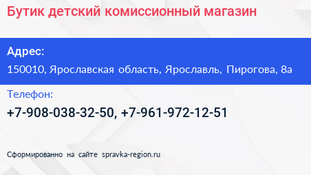 Бутик детский, комиссионный магазин по адресу 150010, Ярославская область, Ярославль, Пирогова, 8а в дальнейшем Организация, размещена в следующих категориях: