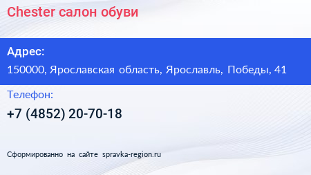 Chester, салон обуви по адресу 150000, Ярославская область, Ярославль, Победы, 41 в дальнейшем Организация, размещена в следующих категориях:
