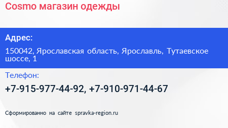 Cosmo, магазин одежды по адресу 150042, Ярославская область, Ярославль, Тутаевское шоссе, 1 в дальнейшем Организация, размещена в следующих категориях: