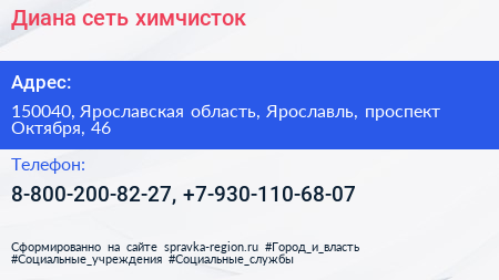 Диана, сеть химчисток по адресу 150040, Ярославская область, Ярославль, проспект Октября, 46 в дальнейшем Организация, размещена в следующих категориях: