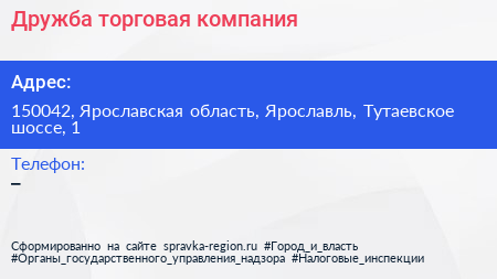 Дружба, торговая компания по адресу 150042, Ярославская область, Ярославль, Тутаевское шоссе, 1 в дальнейшем Организация, размещена в следующих категориях: