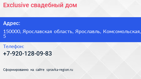 Exclusive, свадебный дом по адресу 150000, Ярославская область, Ярославль, Комсомольская, 5 в дальнейшем Организация, размещена в следующих категориях: