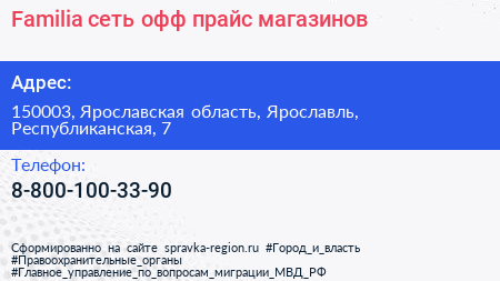 Familia, сеть офф-прайс магазинов по адресу 150003, Ярославская область, Ярославль, Республиканская, 7 в дальнейшем Организация, размещена в следующих категориях: