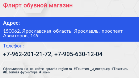 Флирт, обувной магазин по адресу 150062, Ярославская область, Ярославль, проспект Авиаторов, 149 в дальнейшем Организация, размещена в следующих категориях:
