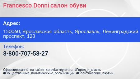Francesco Donni, салон обуви по адресу 150060, Ярославская область, Ярославль, Ленинградский проспект, 123 в дальнейшем Организация, размещена в следующих категориях: