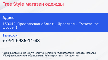 Free Style, магазин одежды по адресу 150042, Ярославская область, Ярославль, Тутаевское шоссе, 1 в дальнейшем Организация, размещена в следующих категориях: