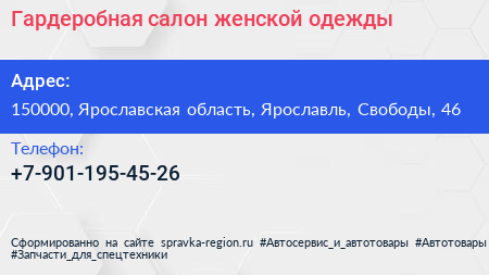 Гардеробная, салон женской одежды по адресу 150000, Ярославская область, Ярославль, Свободы, 46 в дальнейшем Организация, размещена в следующих категориях: