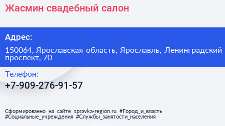 Жасмин, свадебный салон по адресу 150064, Ярославская область, Ярославль, Ленинградский проспект, 70 в дальнейшем Организация, размещена в следующих категориях: