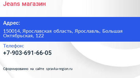 Jeans, магазин по адресу 150014, Ярославская область, Ярославль, Большая Октябрьская, 122 в дальнейшем Организация, размещена в следующих категориях: