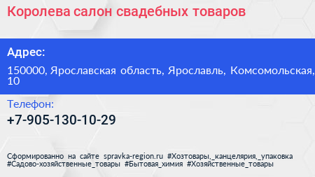Королева, салон свадебных товаров по адресу 150000, Ярославская область, Ярославль, Комсомольская, 10 в дальнейшем Организация, размещена в следующих категориях: