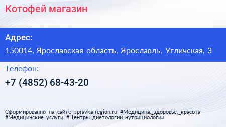 Котофей, магазин по адресу 150014, Ярославская область, Ярославль, Угличская, 3 в дальнейшем Организация, размещена в следующих категориях: