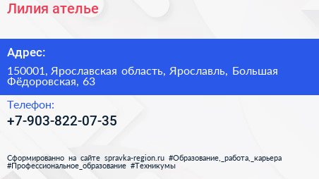 Лилия, ателье по адресу 150001, Ярославская область, Ярославль, Большая Фёдоровская, 63 в дальнейшем Организация, размещена в следующих категориях: