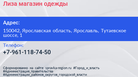 Лиза, магазин одежды по адресу 150042, Ярославская область, Ярославль, Тутаевское шоссе, 1 в дальнейшем Организация, размещена в следующих категориях: