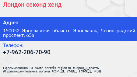 Лондон, секонд хенд по адресу 150052, Ярославская область, Ярославль, Ленинградский проспект, 65а в дальнейшем Организация, размещена в следующих категориях: