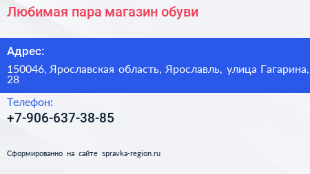 Любимая пара, магазин обуви по адресу 150046, Ярославская область, Ярославль, улица Гагарина, 28 в дальнейшем Организация, размещена в следующих категориях:
