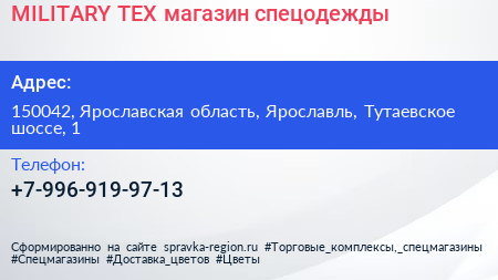 MILITARY-TEX, магазин спецодежды по адресу 150042, Ярославская область, Ярославль, Тутаевское шоссе, 1 в дальнейшем Организация, размещена в следующих категориях: