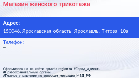 Магазин женского трикотажа по адресу 150046, Ярославская область, Ярославль, Титова, 10а в дальнейшем Организация, размещена в следующих категориях: