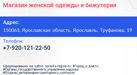 Магазин женской одежды и бижутерии по адресу 150063, Ярославская область, Ярославль, Труфанова, 19 в дальнейшем Организация, размещена в следующих категориях: