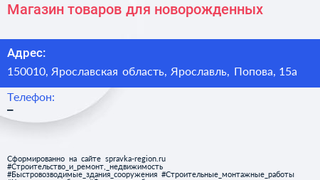 Магазин товаров для новорожденных по адресу 150010, Ярославская область, Ярославль, Попова, 15а в дальнейшем Организация, размещена в следующих категориях: