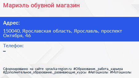 Мариэль, обувной магазин по адресу 150040, Ярославская область, Ярославль, проспект Октября, 46 в дальнейшем Организация, размещена в следующих категориях: